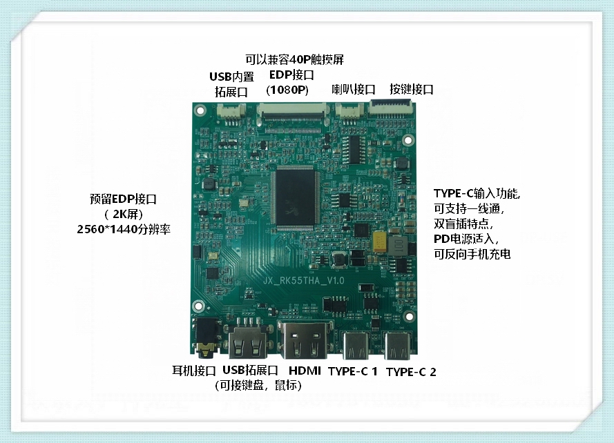 JX-RK55THA 12V PD双盲插Type-C一线通超薄AD板 (支持触摸屏/USB扩展/EDP高清输出)